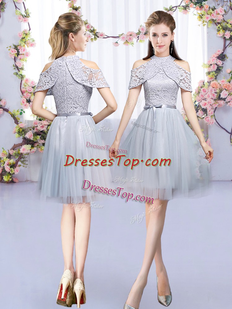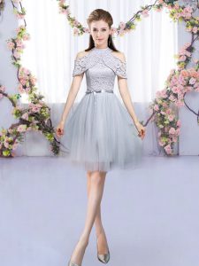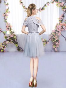 Tulle High-neck Sleeveless Zipper Lace and Belt Dama Dress for Quinceanera in Grey