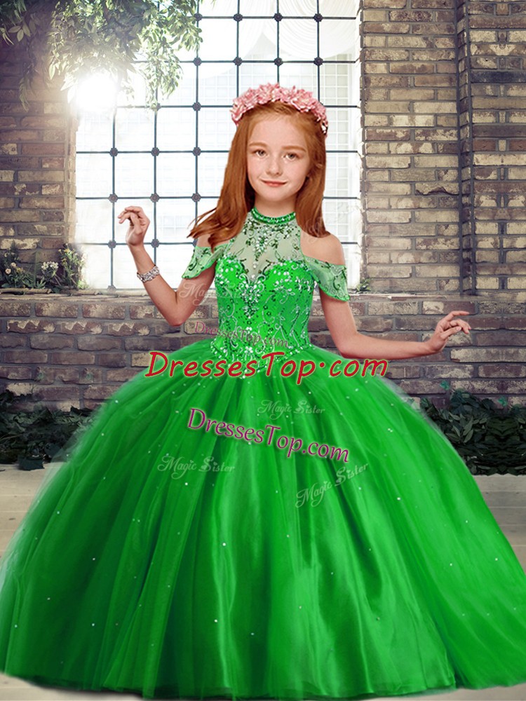 Tulle Lace Up Kids Pageant Dress Sleeveless Floor Length Beading