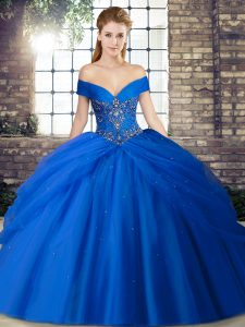 Tulle Off The Shoulder Sleeveless Brush Train Lace Up Beading and Pick Ups Quinceanera Gowns in Royal Blue