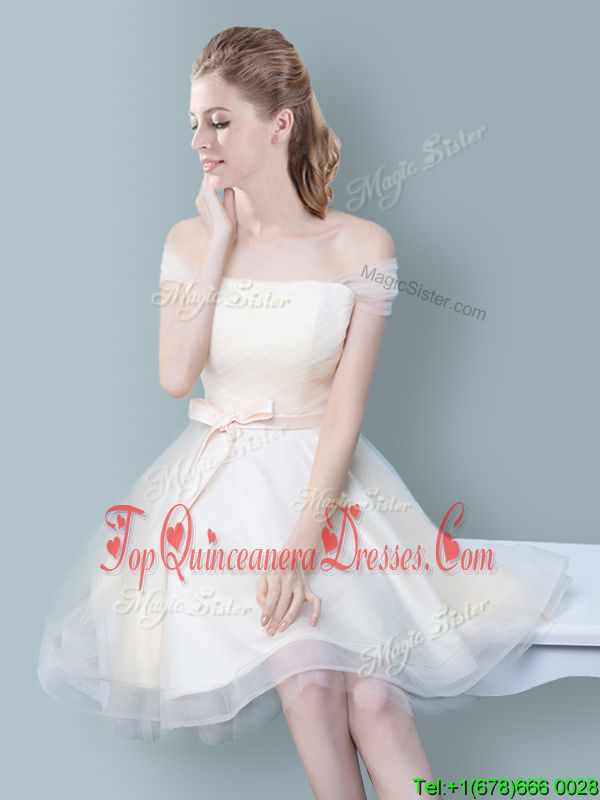 Tulle Off The Shoulder Sleeveless Zipper Ruching and Bowknot Quinceanera Court Dresses in Champagne