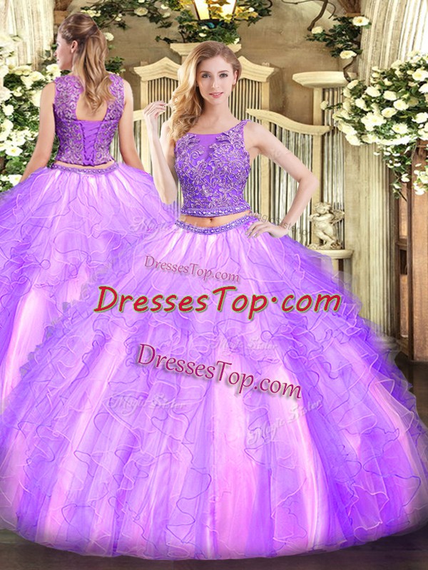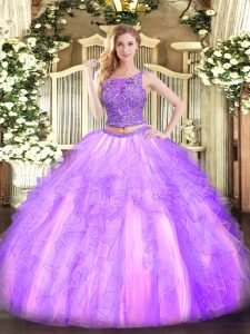 Tulle Scoop Sleeveless Lace Up Beading and Ruffles 15th Birthday Dress in Lavender