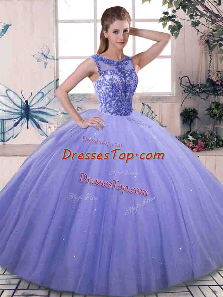 Tulle Scoop Sleeveless Lace Up Beading Sweet 16 Dresses in Lavender