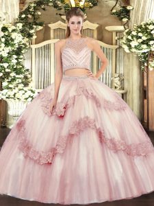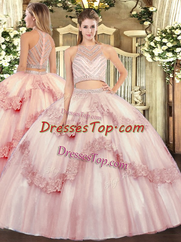 Tulle Scoop Sleeveless Zipper Beading and Appliques Sweet 16 Dresses in Baby Pink