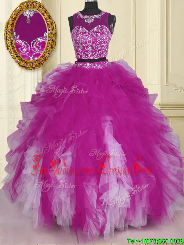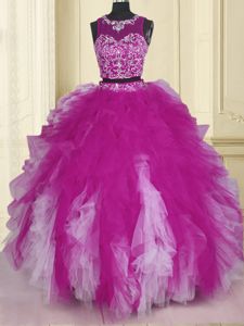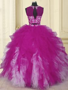 Tulle Scoop Sleeveless Zipper Beading and Ruffles Sweet 16 Quinceanera Dress in Fuchsia