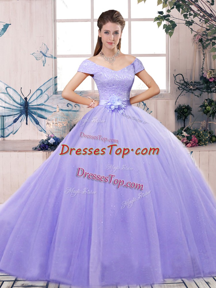 Tulle Short Sleeves Floor Length 15th Birthday Dress and Lace and Hand Made Flower