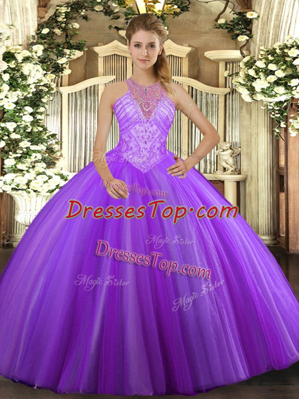 Tulle Sleeveless Floor Length 15 Quinceanera Dress and Beading
