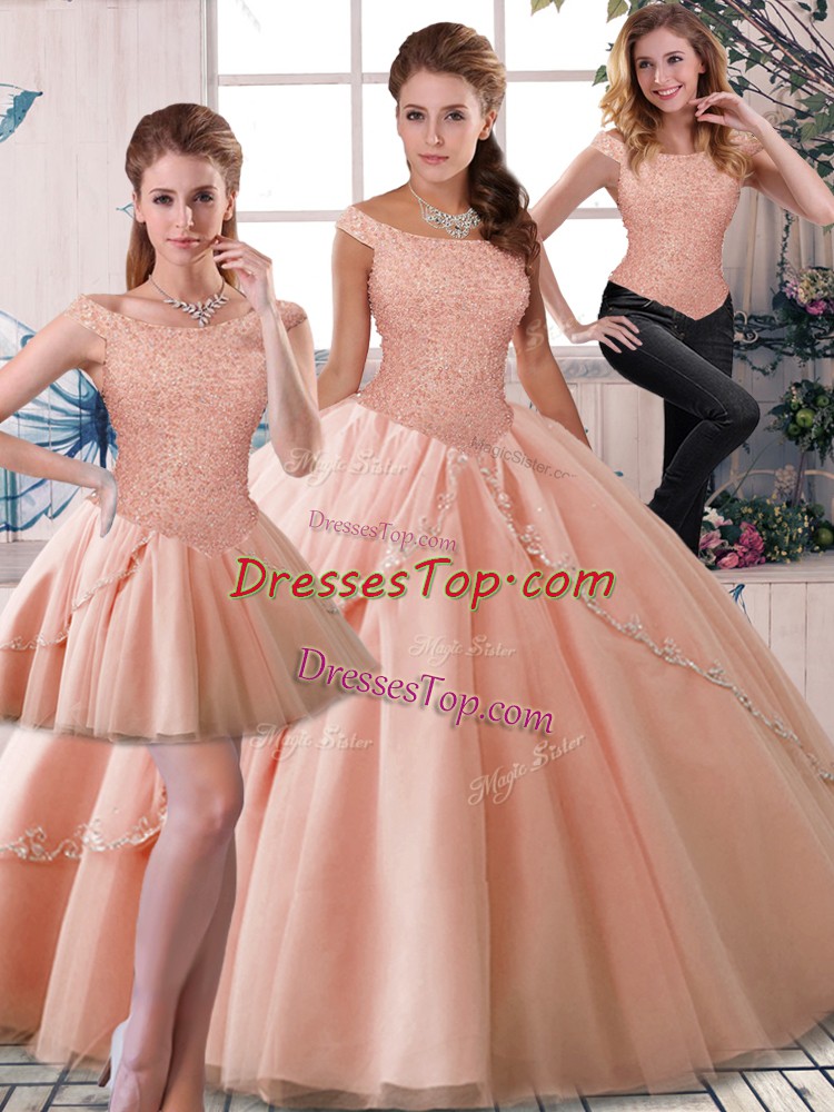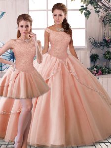 Tulle Sleeveless Quince Ball Gowns Brush Train and Beading