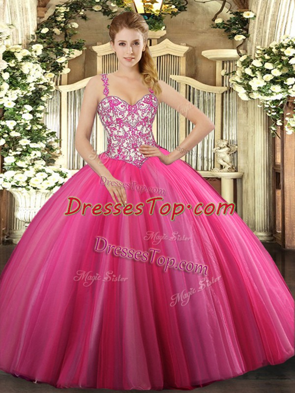 Tulle Straps Sleeveless Lace Up Beading 15 Quinceanera Dress in Hot Pink