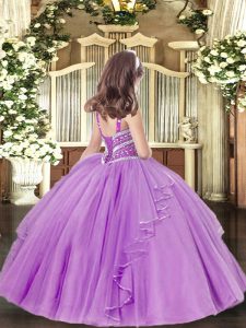 Tulle Straps Sleeveless Lace Up Beading and Ruffles Little Girls Pageant Dress in Pink