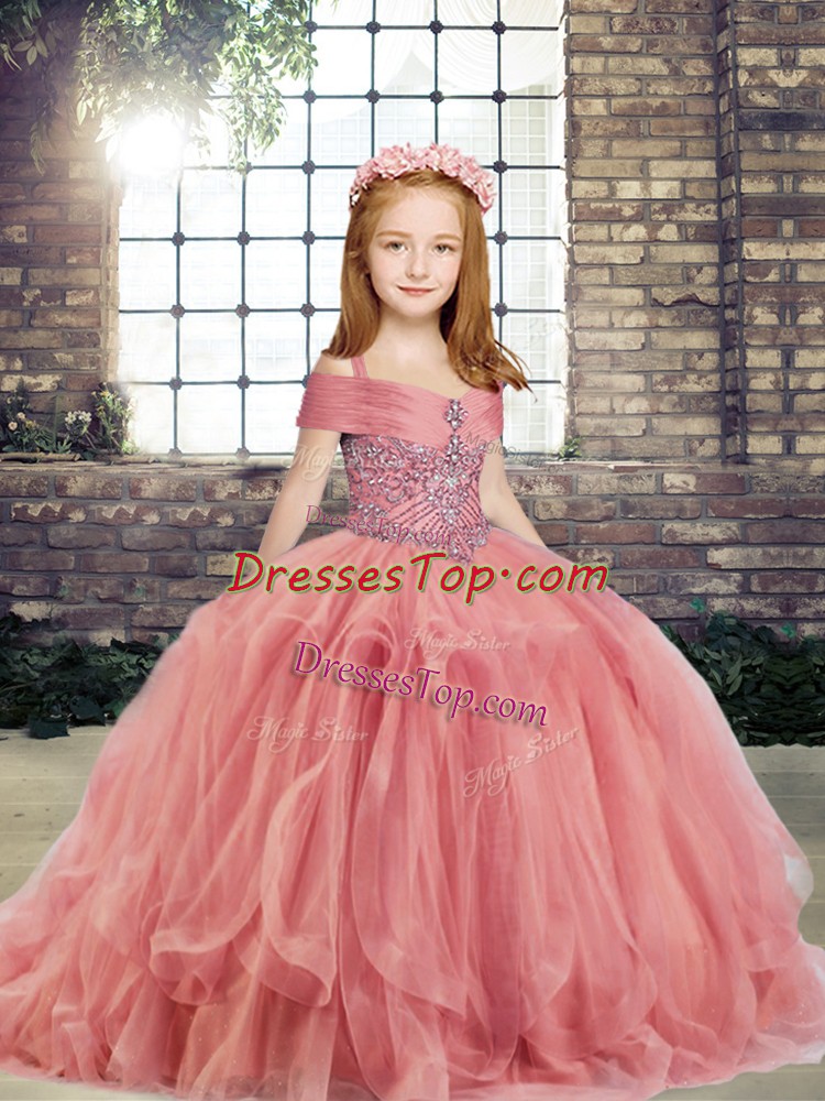 Tulle Straps Sleeveless Lace Up Beading Kids Formal Wear in Watermelon Red