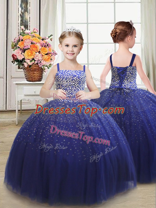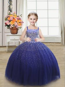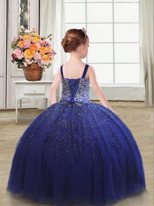 Tulle Straps Sleeveless Lace Up Beading Little Girl Pageant Gowns in Royal Blue