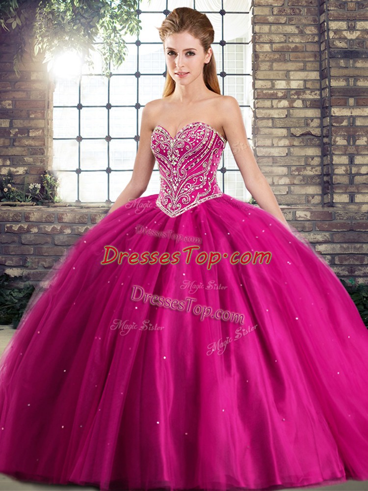 Tulle Sweetheart Sleeveless Brush Train Lace Up Beading Quinceanera Gowns in Fuchsia