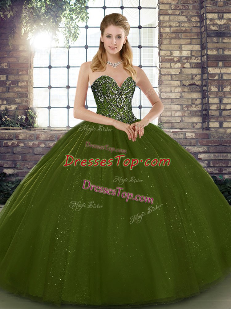 Tulle Sweetheart Sleeveless Lace Up Beading Ball Gown Prom Dress in Olive Green