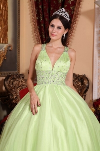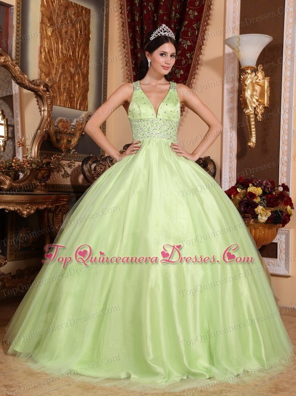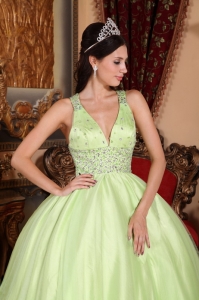 Tulle Taffeta Quinces Dress Yellow Green V-neck Beading