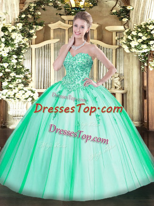 Turquoise Ball Gowns Appliques Quinceanera Dresses Lace Up Tulle Sleeveless Floor Length