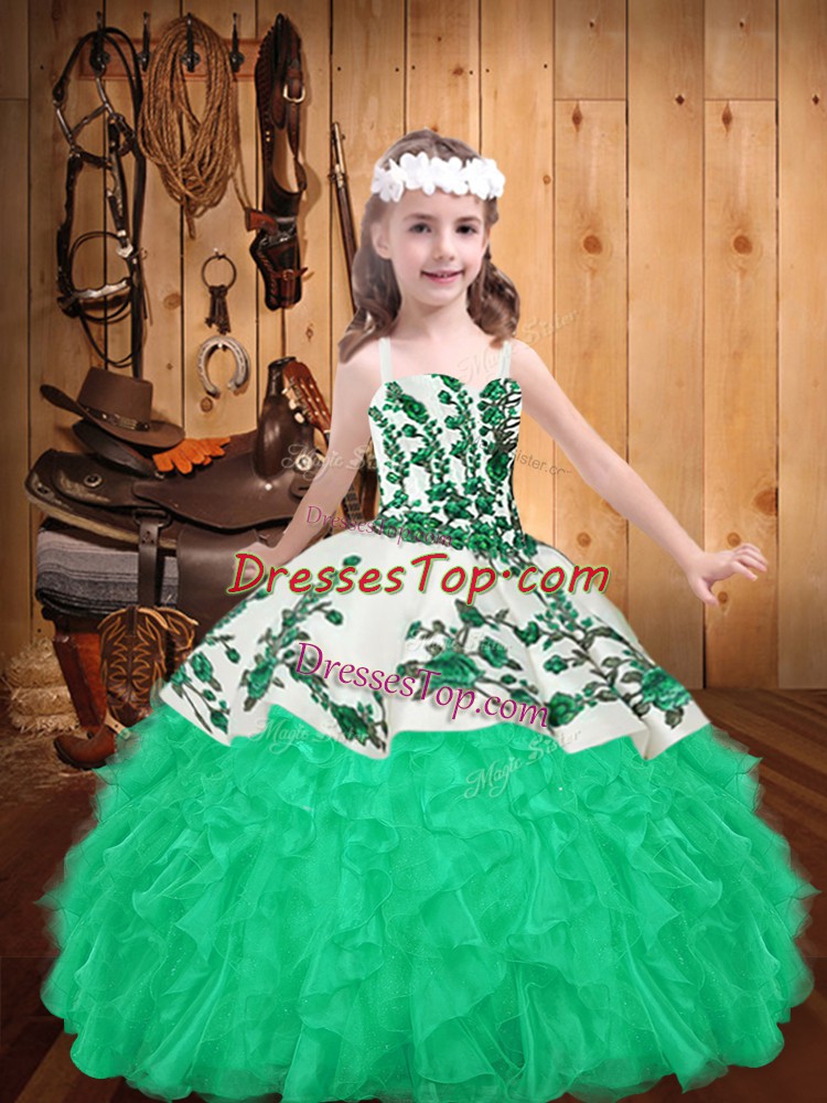 Turquoise Ball Gowns Straps Sleeveless Organza Floor Length Lace Up Embroidery and Ruffles Pageant Gowns