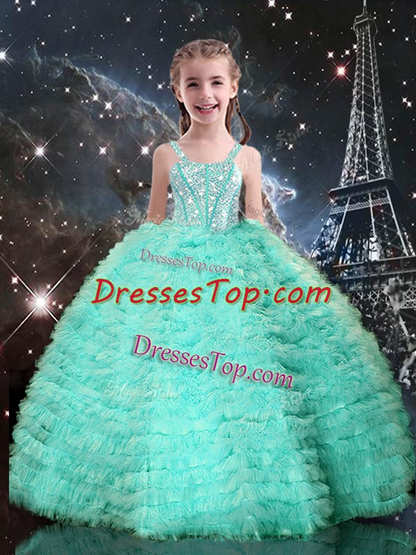 Turquoise Ball Gowns Straps Sleeveless Tulle Floor Length Lace Up Beading and Ruffled Layers Pageant Dress for Teens