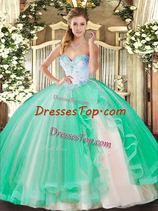 Turquoise Ball Gowns Sweetheart Sleeveless Tulle Floor Length Lace Up Beading and Ruffles Quinceanera Gown