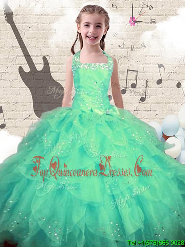Turquoise Halter Top Lace Up Beading and Ruffles Little Girls Pageant Gowns Sleeveless