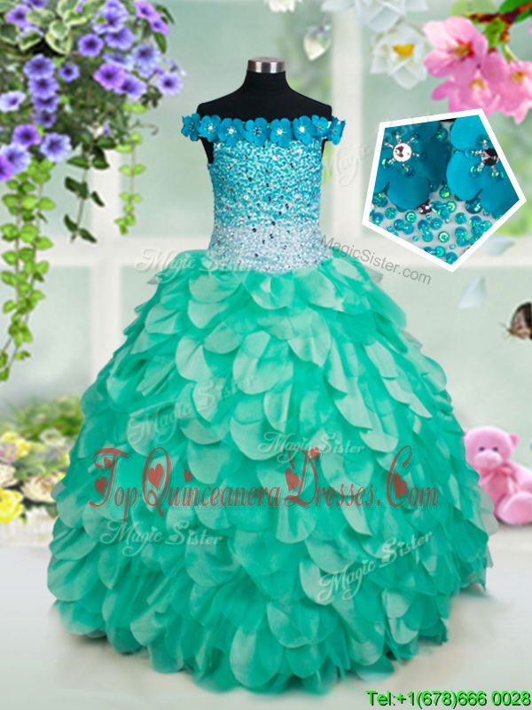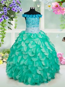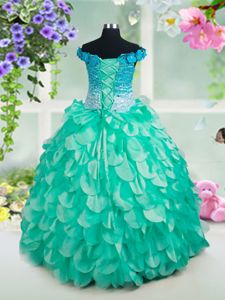 Turquoise Off The Shoulder Neckline Beading and Appliques and Ruffles Winning Pageant Gowns Sleeveless Lace Up