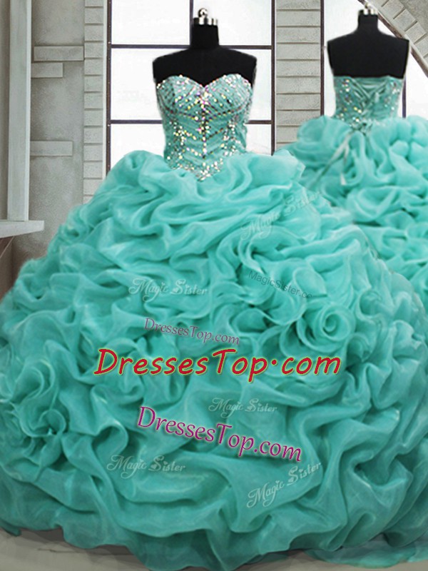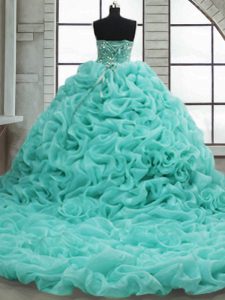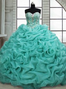 Turquoise Organza Lace Up 15th Birthday Dress Sleeveless Brush Train Beading and Pick Ups