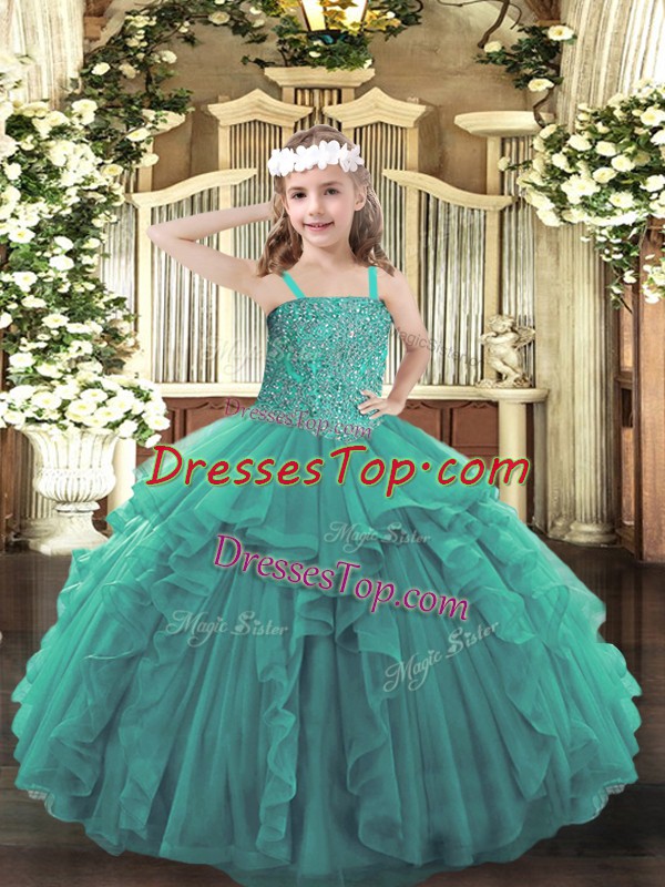 Turquoise Pageant Dress for Womens Party and Quinceanera with Beading and Ruffles Straps Sleeveless Lace Up