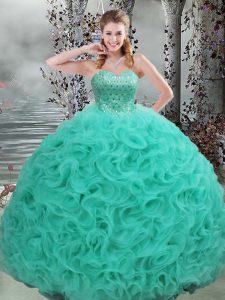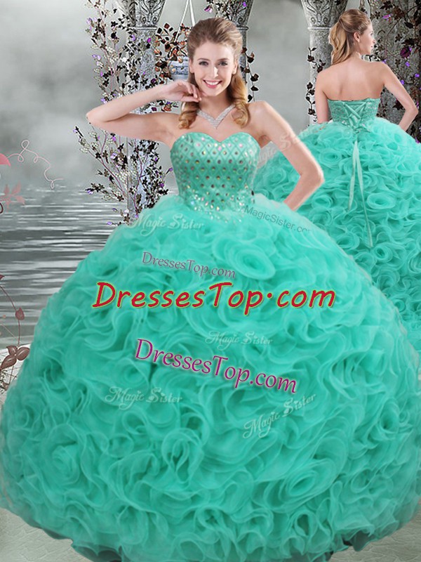 Turquoise Sleeveless Fabric With Rolling Flowers Brush Train Lace Up Quinceanera Gown for Military Ball and Sweet 16 and Quinceanera