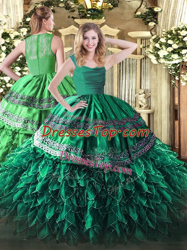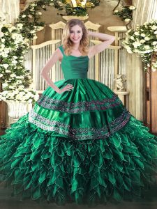 Turquoise Sleeveless Floor Length Appliques and Ruffles Zipper 15th Birthday Dress