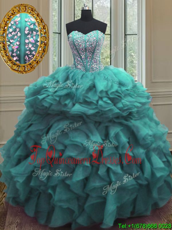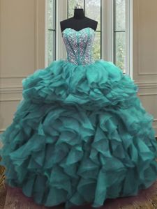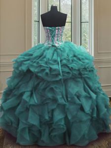 Turquoise Sleeveless Organza Lace Up Ball Gown Prom Dress for Military Ball and Sweet 16 and Quinceanera