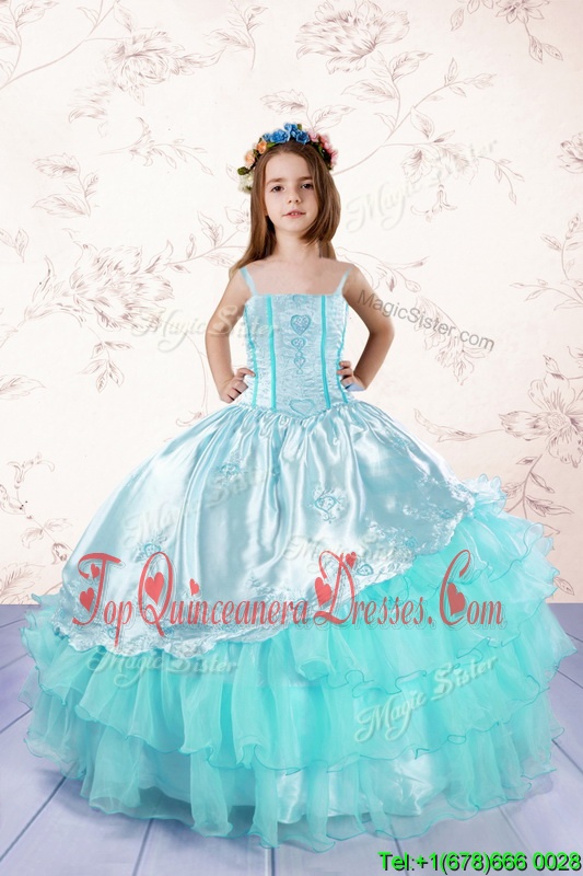 Turquoise Spaghetti Straps Lace Up Embroidery and Ruffled Layers Kids Pageant Dress Sleeveless