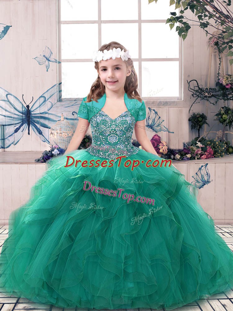Turquoise Straps Side Zipper Beading Little Girls Pageant Gowns Sleeveless