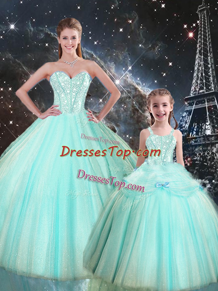 Turquoise Tulle Lace Up Sweetheart Sleeveless Floor Length Vestidos de Quinceanera Beading