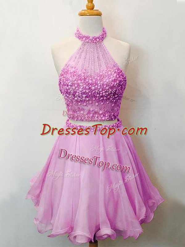 Two Pieces Court Dresses for Sweet 16 Lilac Halter Top Organza Sleeveless Knee Length Lace Up
