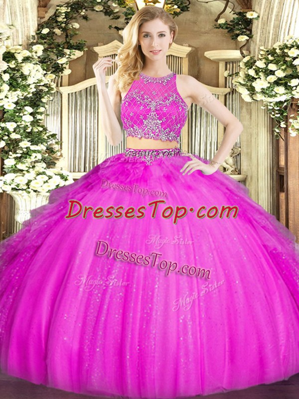 Two Pieces Quinceanera Gown Fuchsia Scoop Tulle Sleeveless Floor Length Zipper