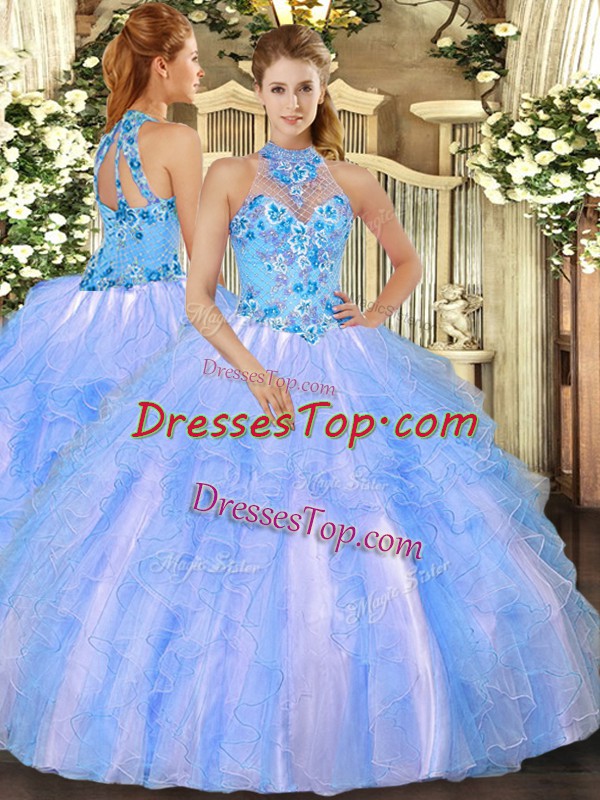 Unique Baby Blue Halter Top Neckline Embroidery and Ruffles Quince Ball Gowns Sleeveless Lace Up