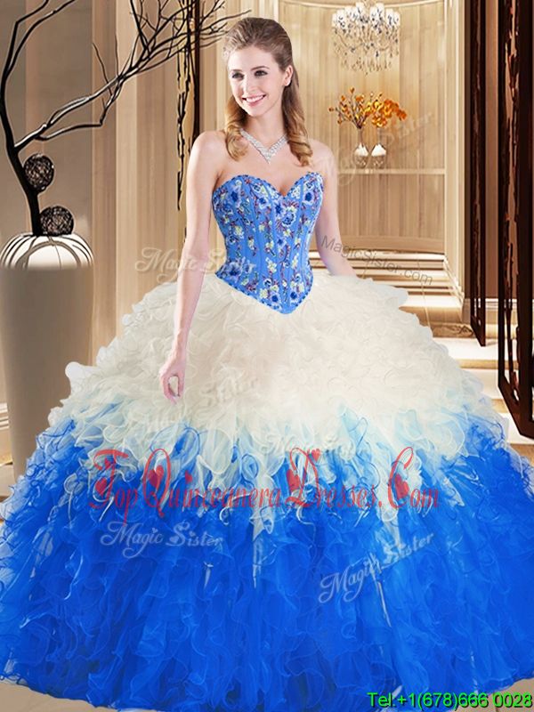 Unique Floor Length Lace Up Sweet 16 Quinceanera Dress Blue And White and In for Military Ball and Sweet 16 with Embroidery and Ruffles