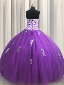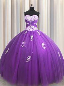 Unique Floor Length Lace Up Sweet 16 Quinceanera Dress Purple and In for Military Ball and Sweet 16 and Quinceanera with Beading and Appliques