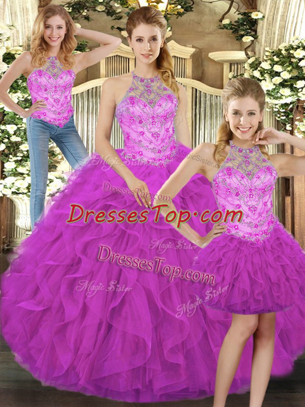Unique Fuchsia Three Pieces Halter Top Sleeveless Tulle Floor Length Lace Up Beading and Ruffles Quinceanera Gown