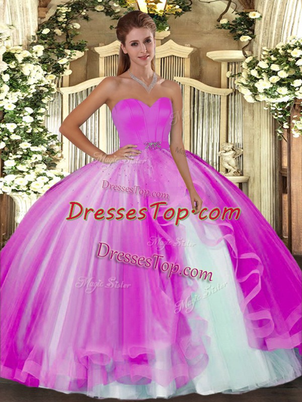 Unique Fuchsia Tulle Lace Up Sweetheart Sleeveless Floor Length Sweet 16 Quinceanera Dress Beading