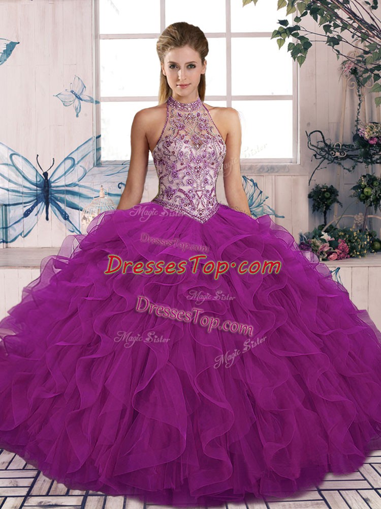 Unique Purple Ball Gown Prom Dress Military Ball and Sweet 16 and Quinceanera with Beading and Ruffles Halter Top Sleeveless Lace Up