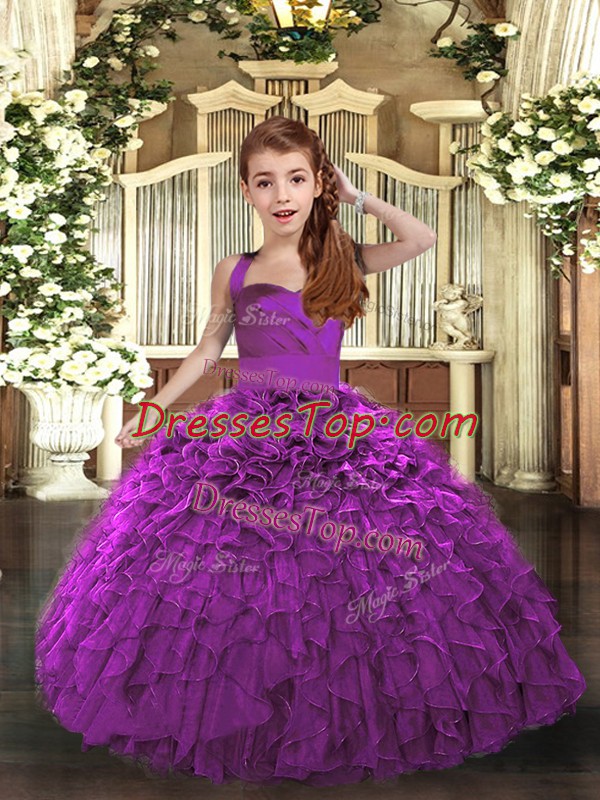 Unique Purple Ball Gowns Straps Sleeveless Organza Floor Length Lace Up Ruffles Girls Pageant Dresses