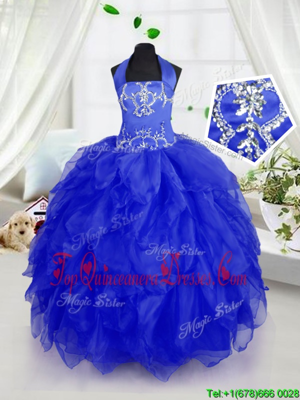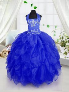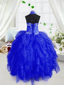 Unique Royal Blue Halter Top Lace Up Appliques and Ruffles Little Girls Pageant Dress Wholesale Sleeveless