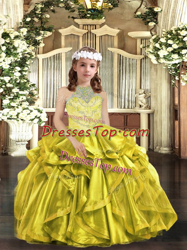 Unique Sleeveless Lace Up Little Girls Pageant Dress Yellow Green Organza