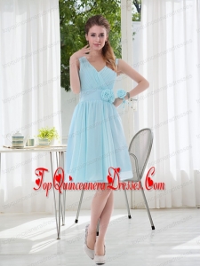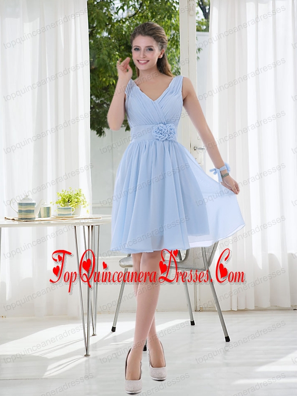 V Neck Chiffon Dama Dress with Ruching and Hand Made Flowers