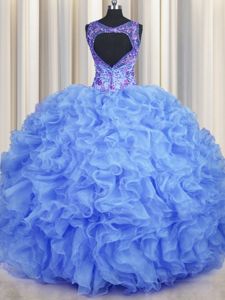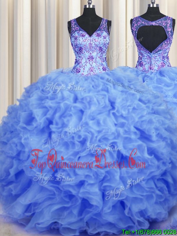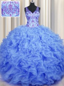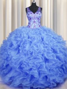 V-neck Sleeveless 15 Quinceanera Dress Floor Length Beading and Appliques and Ruffles Blue Organza