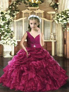 V-neck Sleeveless Kids Pageant Dress Floor Length Beading and Ruffles and Pick Ups Fuchsia Organza