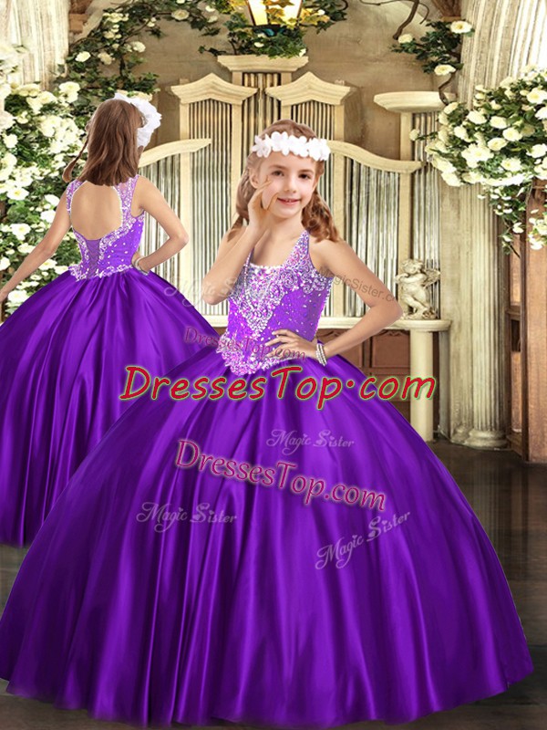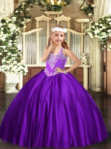 V-neck Sleeveless Pageant Dress Wholesale Floor Length Beading Purple Satin