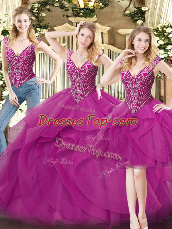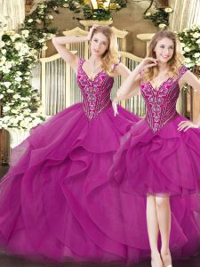 V-neck Sleeveless Quinceanera Gown Floor Length Beading and Ruffles Fuchsia Organza