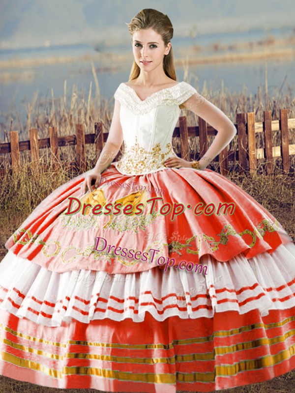 V-neck Sleeveless Satin Ball Gown Prom Dress Embroidery and Ruffled Layers Lace Up