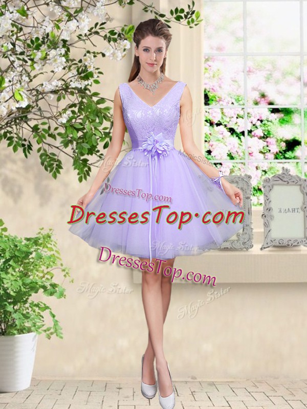 V-neck Sleeveless Vestidos de Damas Knee Length Lace and Belt Lilac Tulle